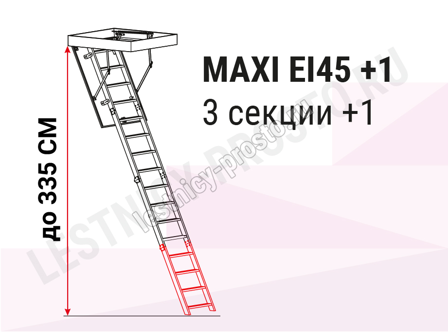 Данный вариант представляет из себя комплект из лестницы MAXI EI45 и дополнительной секции, увеличивающей базовую высоту до 3350 мм. Крышка лестницы MAXI EI45 отличается двойным уплотнением, состоящим из одинарного противопожарного уплотнения и крышки утепленной пенопластом.