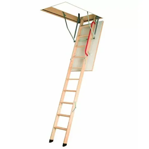 Лестница складная трёхсекционная, изготовлена из сосны. Термоизоляционная крышка типа "сэндвич" утеплена пенопластом, облицована с двух сторон ДСП белого цвета. Короб люка с однослойным уплотнителем. Все металлические элементы лестницы покрыты порошковой краской, ступени лестницы имеют антискользящие насечки и закреплены в столярное соединение «ласточкин хвост», что позволяет выдерживать нагрузку до 150 кг. Деревянный стержень для открывания лестницы в комплекте.