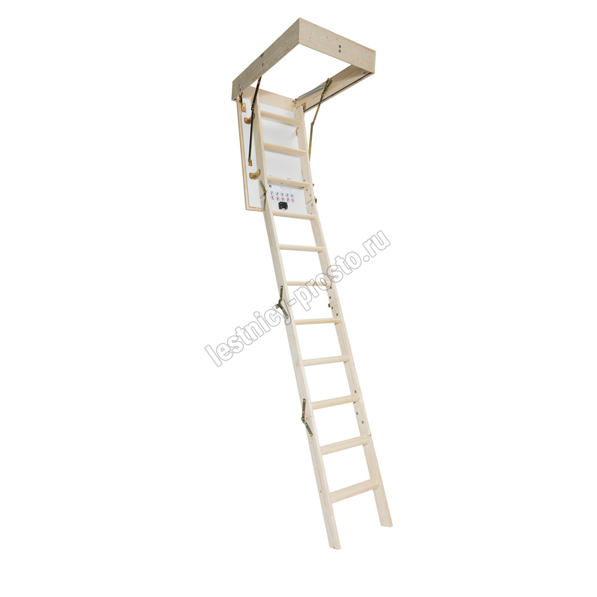 Четырехсекционная складная лестница из ели. Высота лестницы от потолка до пола: 2870 мм, с помощью дополнительной секции можно увеличить высоту до 3300 мм