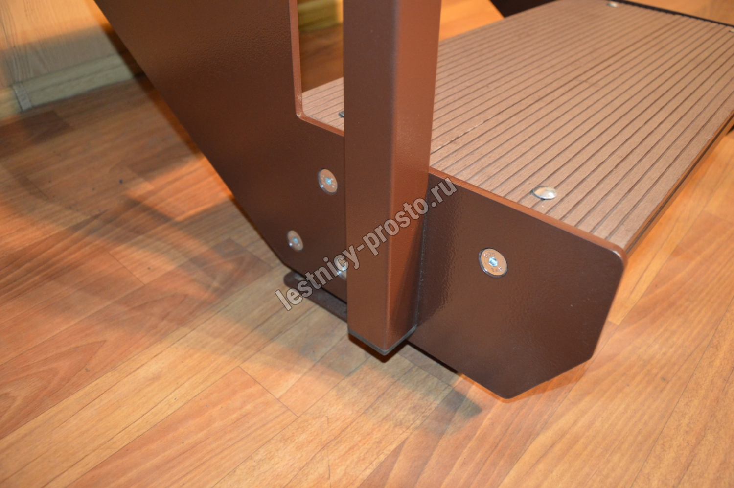 Ступени лестницы состоят из металлической рамки, обеспечивающей необходимую прочность, и покрытия из террасной доски ДПК (древесно-полимерный композит). Ступени не боятся воды и мороза, не теряют со временем свой внешний вид и не требуют ухода.