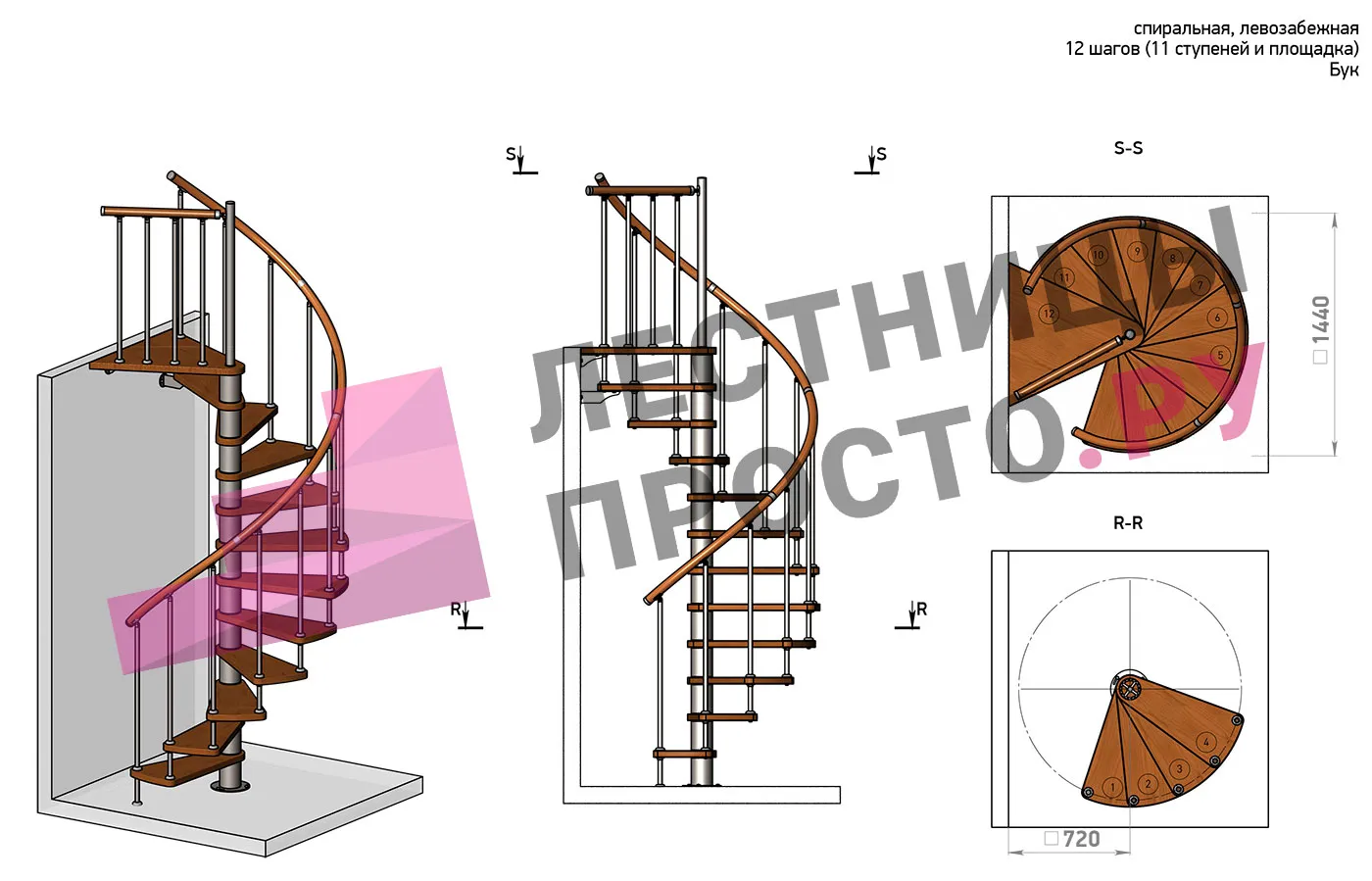 Левая, d=140см, 11 ступеней + площадка