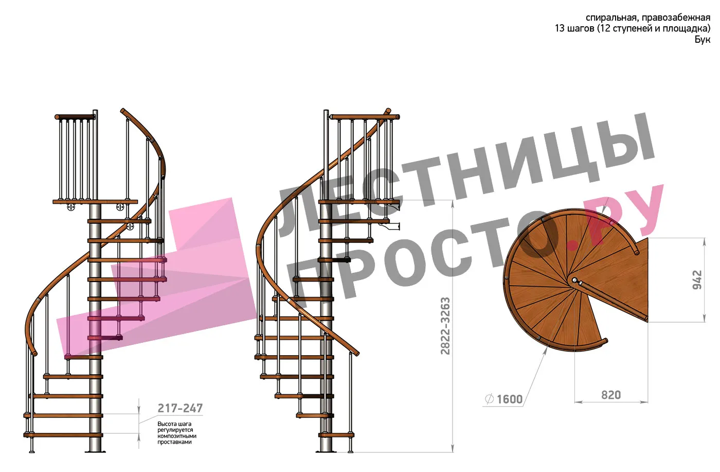 Решение о направлении поворота принимается при сборке лестницы - универсальная конструкция позволяет собрать правозабежную и левозабежную лестницы. Ширина ступени между центральной колонной и поручнем ≈ 680 мм