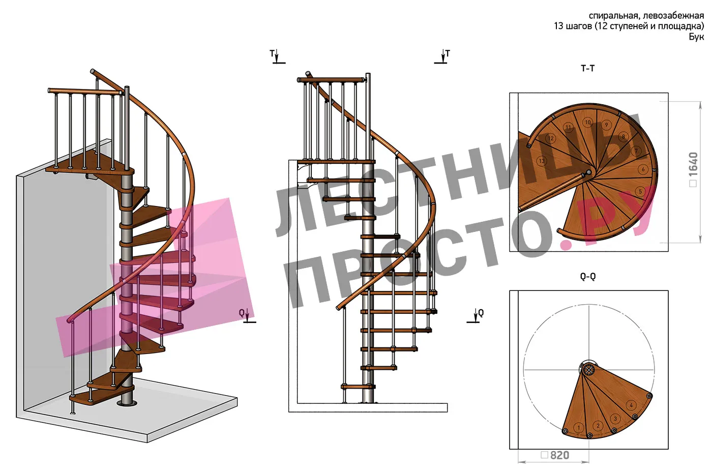 Винтовая лестница Prosto Spiral Black D160см, h282.2-326,3 см, бук