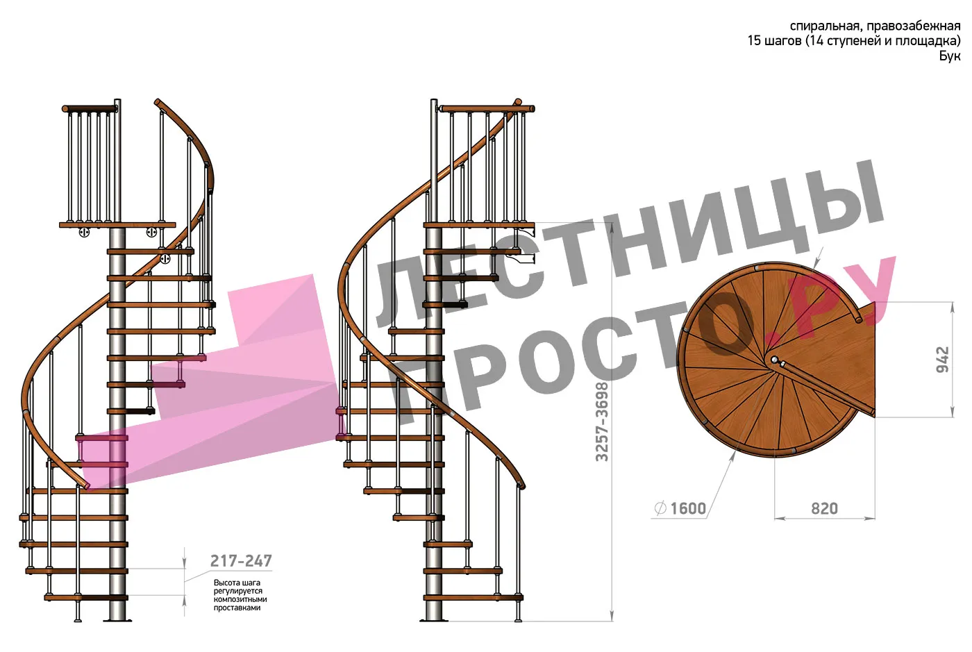 Винтовая лестница Prosto Spiral Black D160см, h325.7-369.8 см, бук