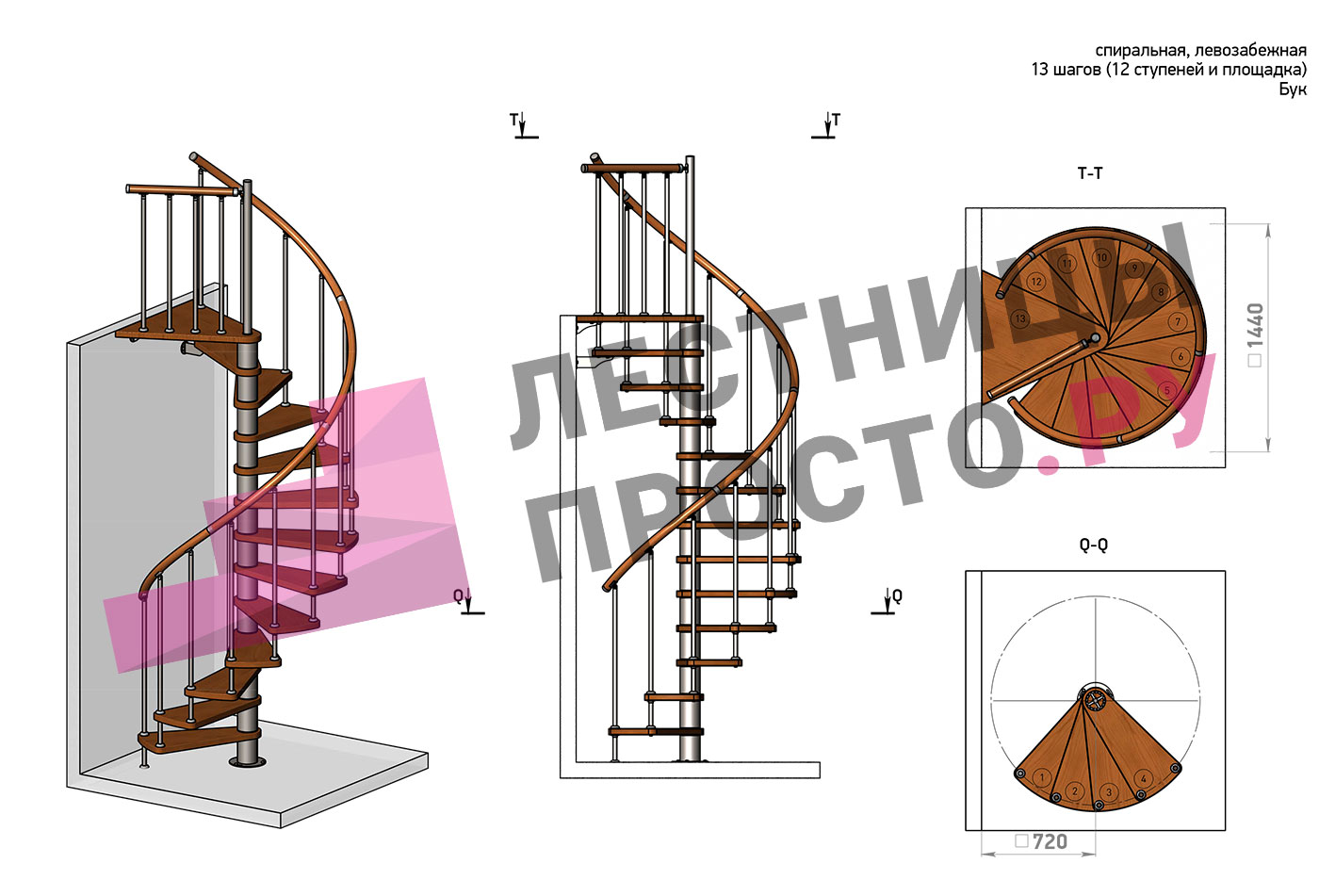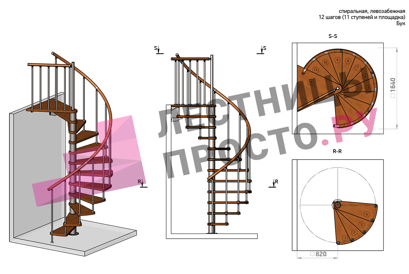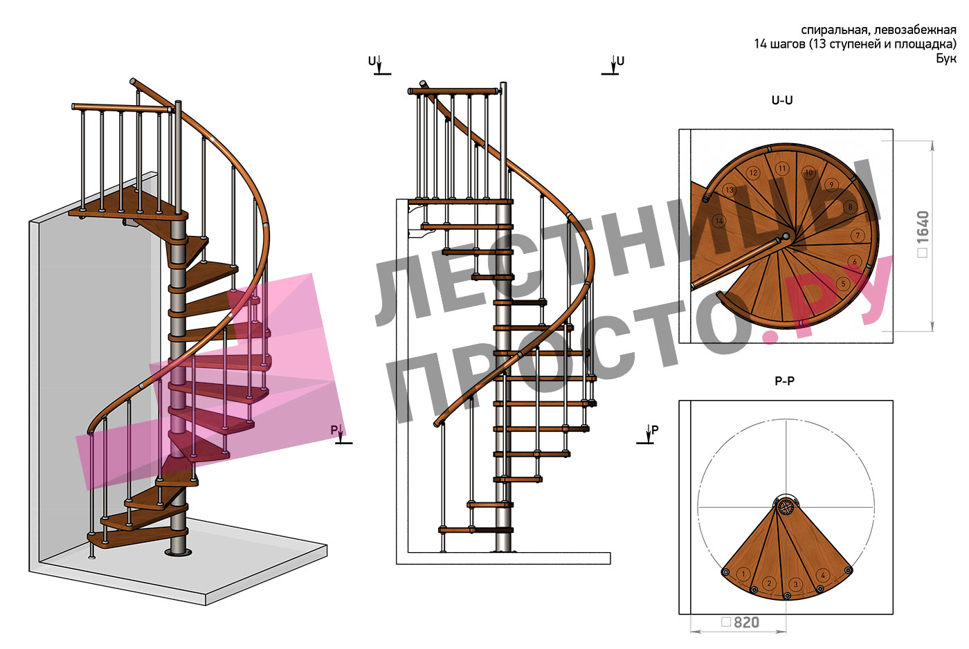 Винтовая лестница Prosto Spiral Black D140см, h282.2-326,3 см, бук |