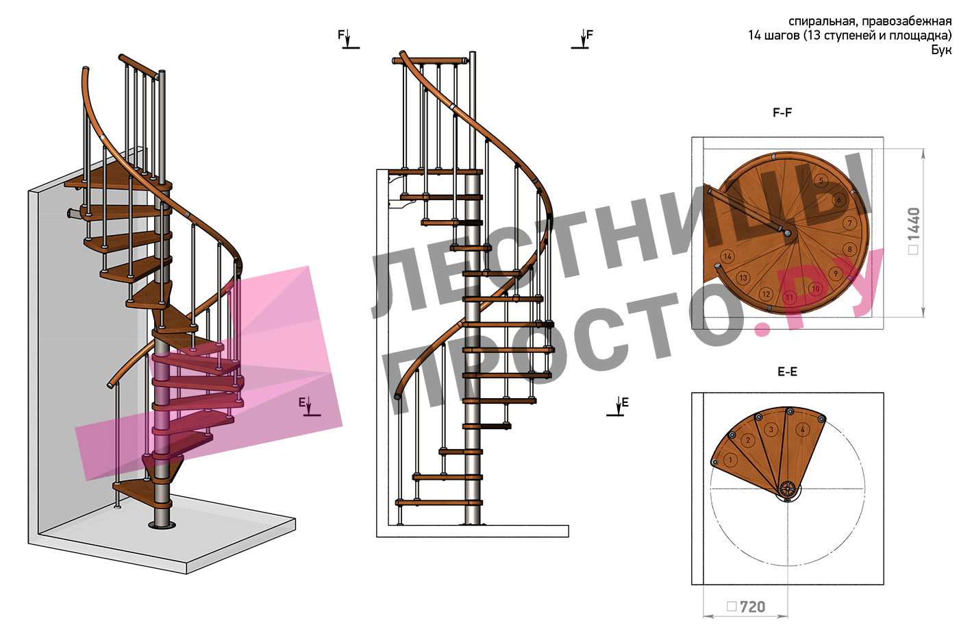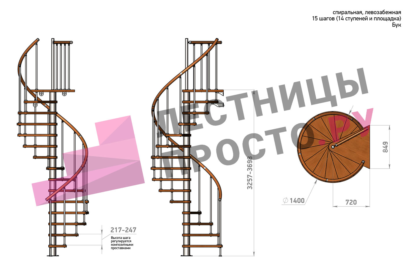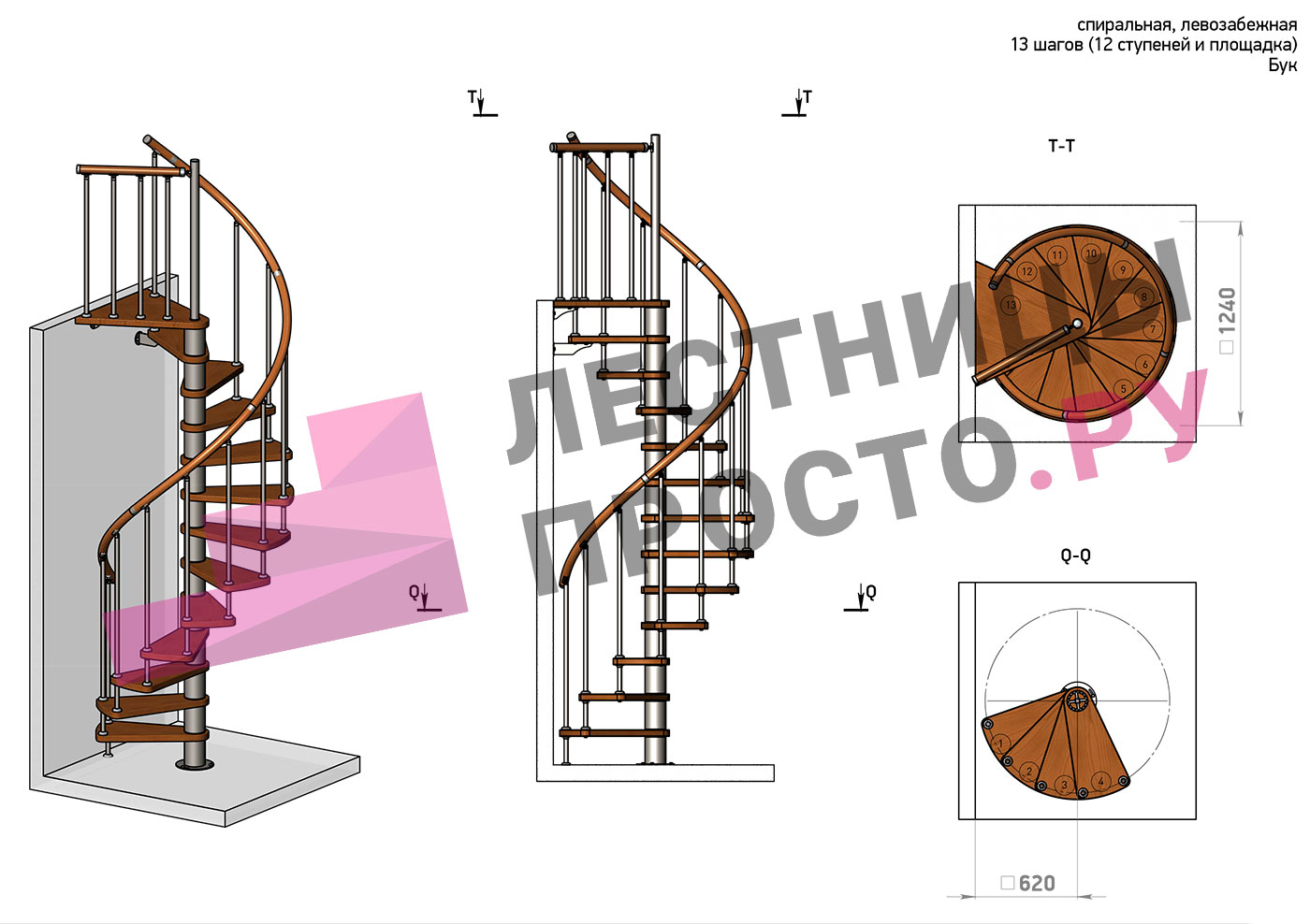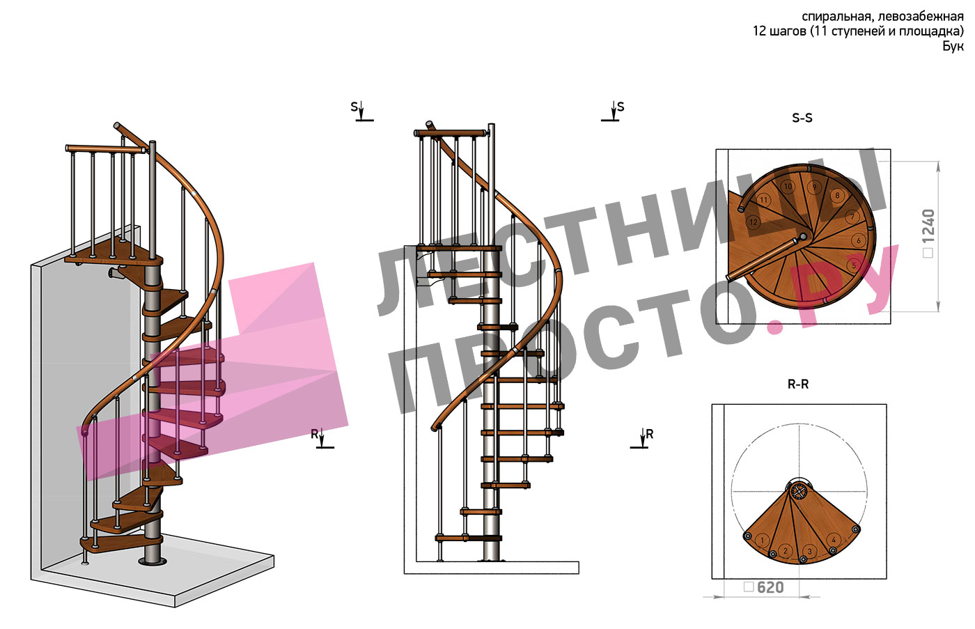 Винтовая лестница Prosto Spiral Black D140см, h282.2-326,3 см, бук |
