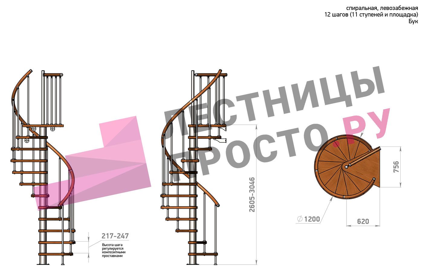 Винтовая лестница Prosto Spiral Black D120см, h260.5-304.6 см, бук |