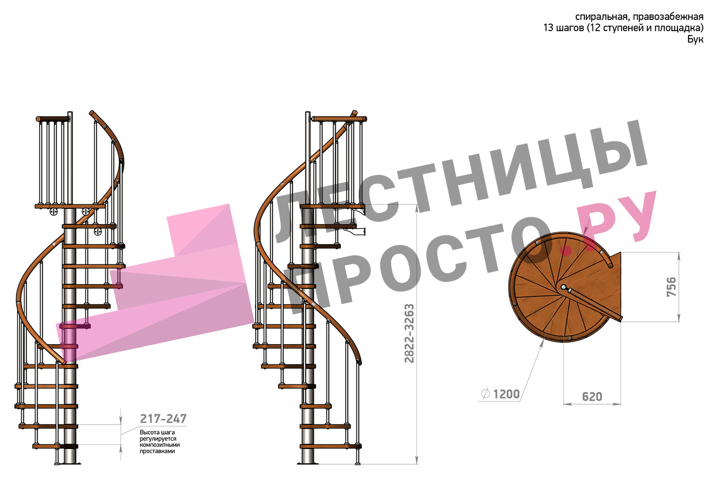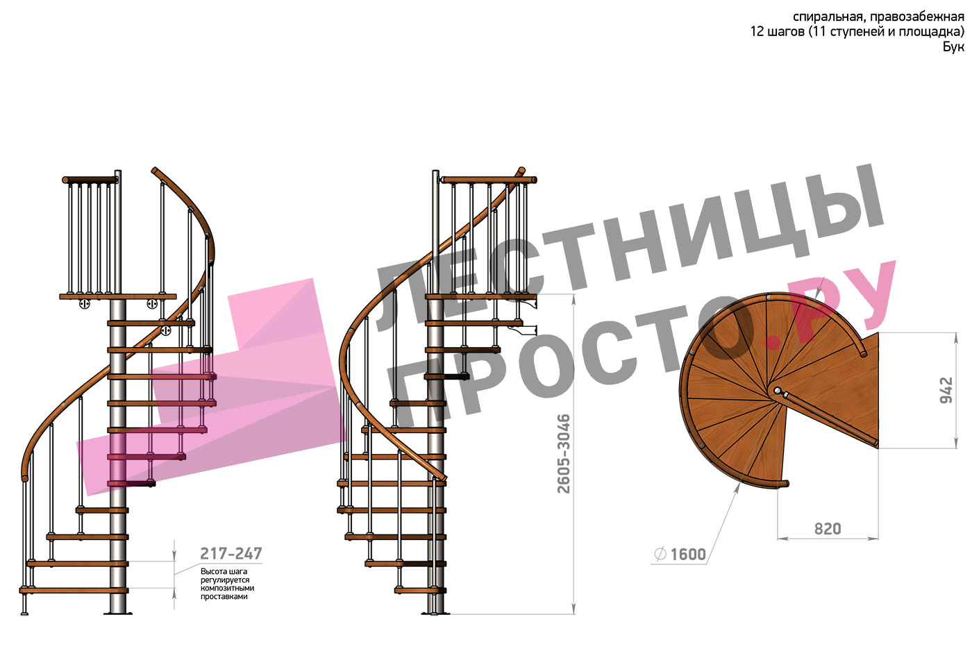Винтовая лестница Prosto Spiral White D120см, h260.5-304.6 см, бук |